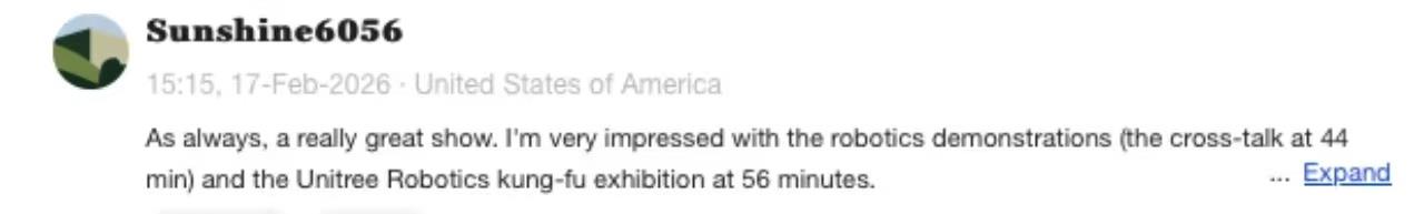 英语网友Sunshine6056:一如既往,这是一场相等精彩的献技。我对机器东说念主献技的小品以及宇树机器东说念主展示的功夫饰演印象尤为深入。
