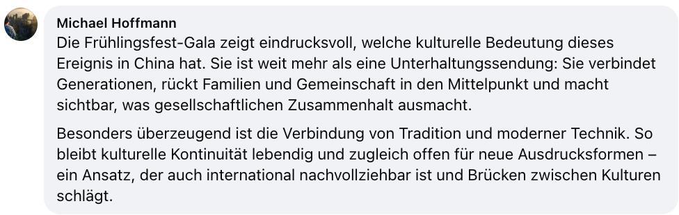 德国网友霍夫曼:总台春晚这一文化盛事不仅是综艺节目,更统一代际、家庭与社会,突清楚社会的凝华力。晚会传统与现代科技的结合令东说念主轰动,这一交融发展理念有助于股东端淑疏通互鉴。