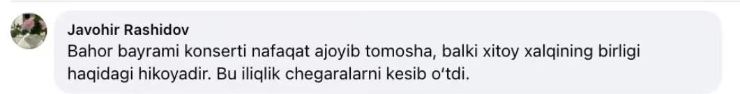 乌兹别克斯坦网友贾沃希尔·拉希多夫:春晚不仅是精彩饰演,更是中国东说念主团圆的故事,这份仁爱跨越了国界。